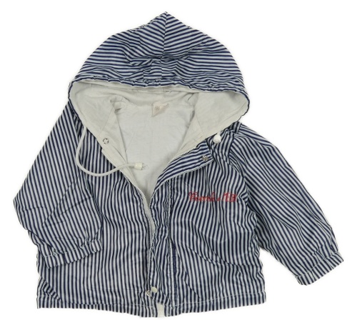 Tmavomodro-biela pruhovaná šušťáková jarná bunda s logom a kapucňou