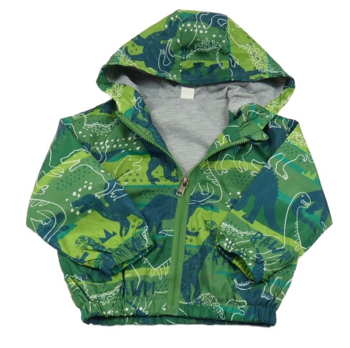 Zelená šušťáková jarná bunda s dinosaurami a kapucňou