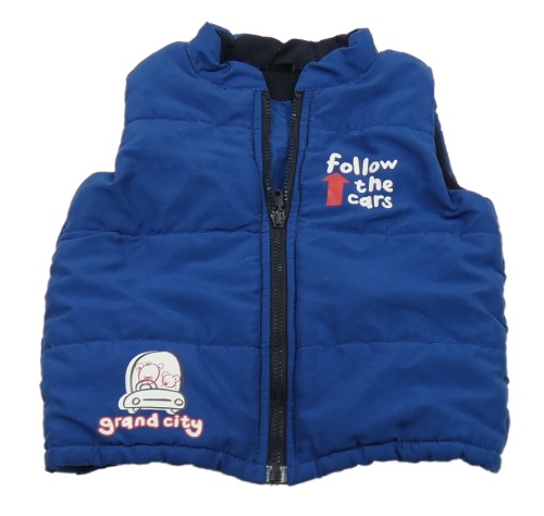 Tmavomodrá šušťáková zateplená vesta s nápisom