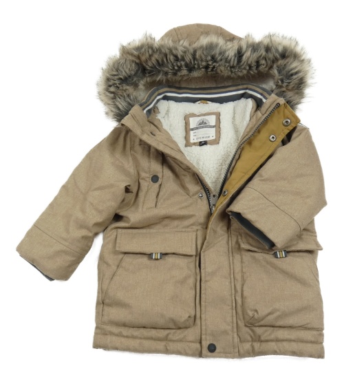 Béžová šušťáková zimná bunda s nápisom a kapucňou s kožešinou C&A