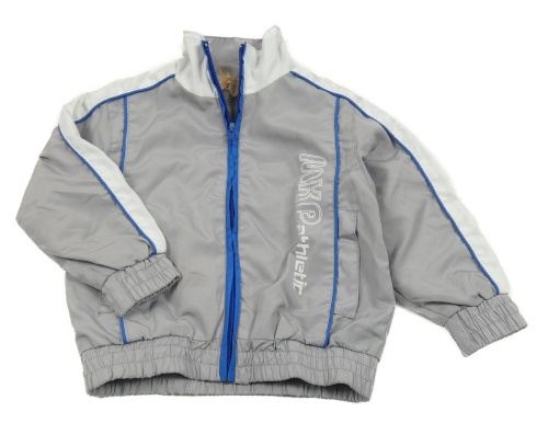 Sivo-modro-biela šušťáková jarná bunda s nápisom