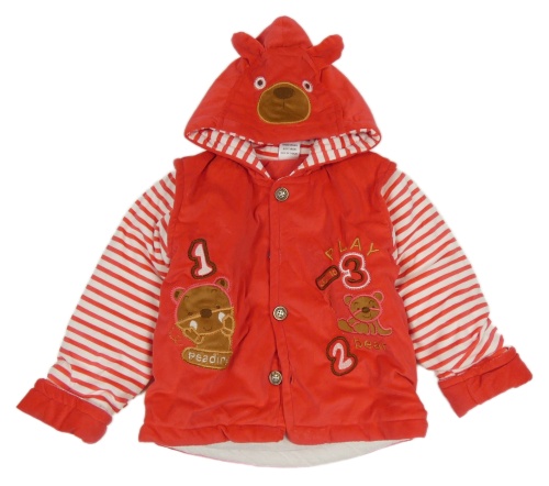 Červeno-pruhovaná zamatová zateplená bunda s nápismi a kapucňou