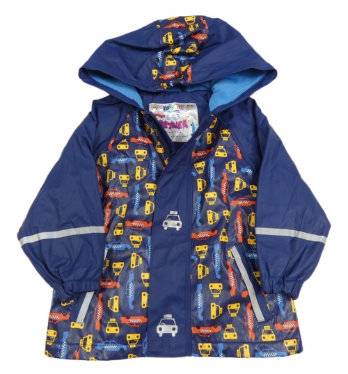 Tmavomodrá nepromokavá lehce zateplená bunda s autami a kapucňou Lupilu
