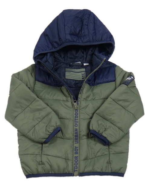 Tmavomodro-khaki šušťáková prešívaná zateplená bunda s nápisom a kapucňou Impidimpi