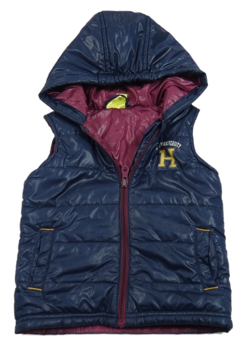 Tmavomodrá šušťáková zateplená vesta s písmenem a kapucňou