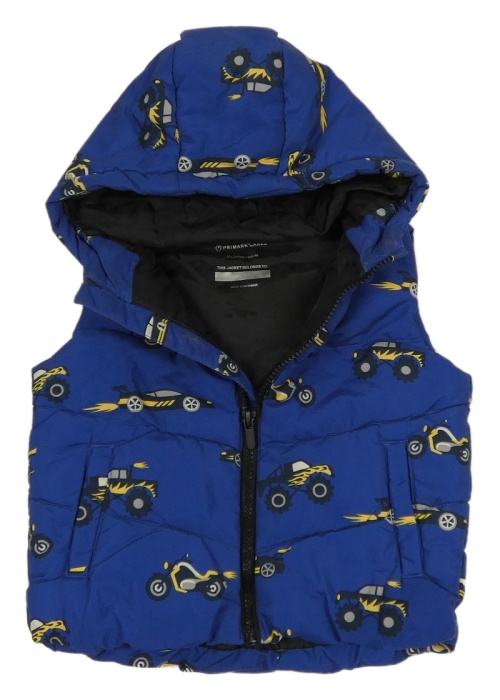 Tmavomodrá šušťáková zateplená vesta s monster trucky a kapucňou Primark