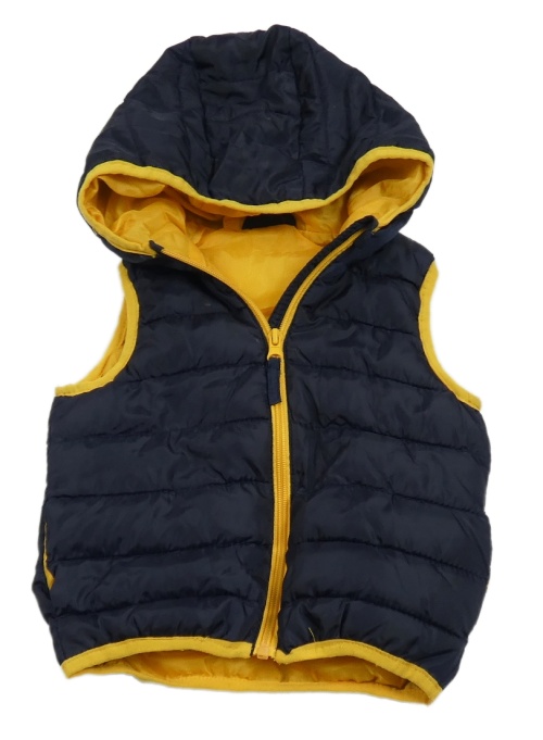 Tmavomodro-žltá šušťáková prešívaná zateplená vesta s kapucňou Kiki&Koko
