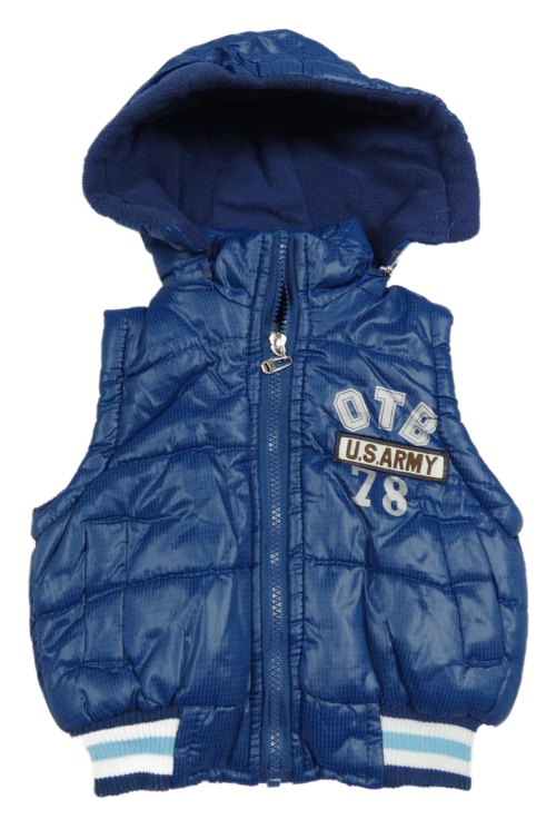 • Modro-tmavomodrá kockovaná prešívaná šušťáková zateplená vesta s číslom a odopínacíá kapucňou