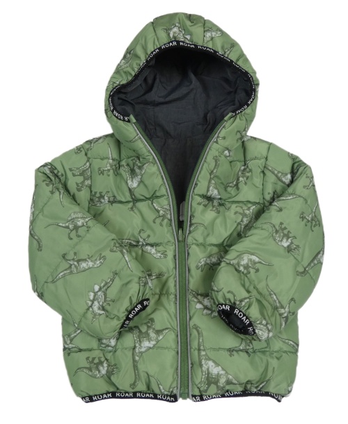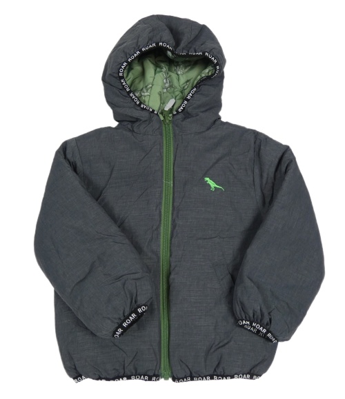 Zelená šušťáková zateplená obojstranná bunda s dinosaurami a kapucňou Nutmeg