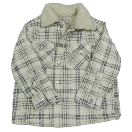 • Bielo-sivo-béžová kockovaná menšestrová zateplená košeľová bunda s golierikom s beránkem tu