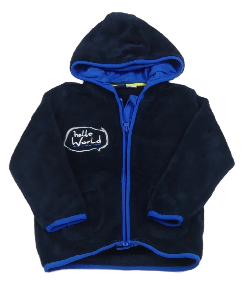 Tmavomodrá plyšová bunda s nápismi a kapucňou lupilu