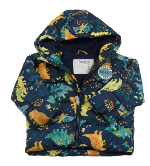 Tmavomodrá šušťáková prešívaná zimná kombinéza s dinosaurami a kapucňou Nutmeg