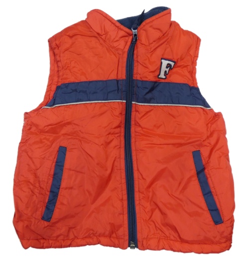 Červeno-tmavomodrá šušťáková zateplená vesta s písmenem