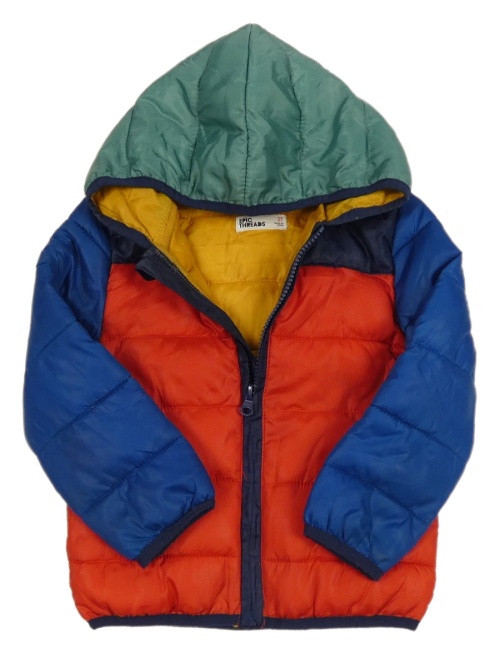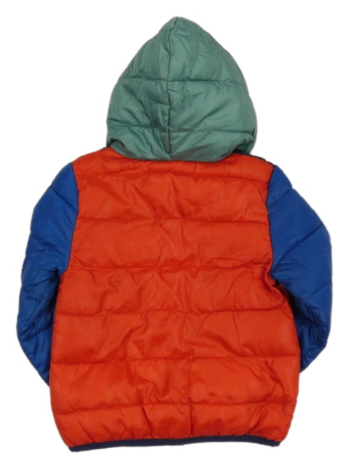 Červeno-modro-khaki prešívaná šušťáková zateplená bunda s kapucňou