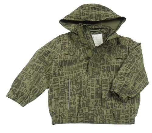 Khaki šušťáková jarná bunda s nápismi a kapucňou