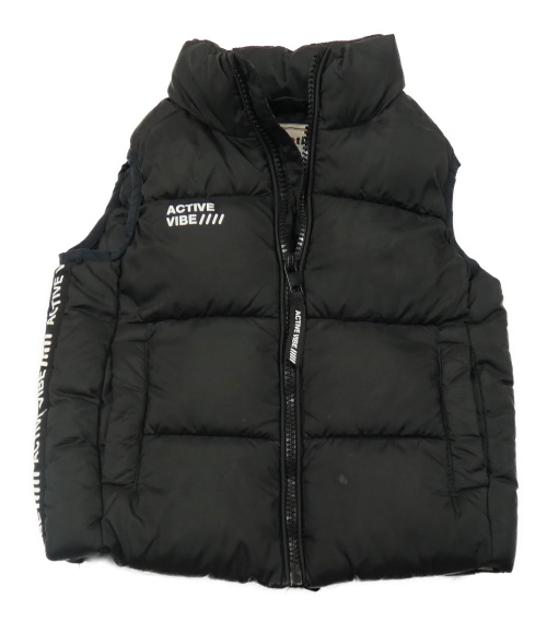 Čierna prešívaná šušťáková zateplená vesta s nápismi a pruhom minoti