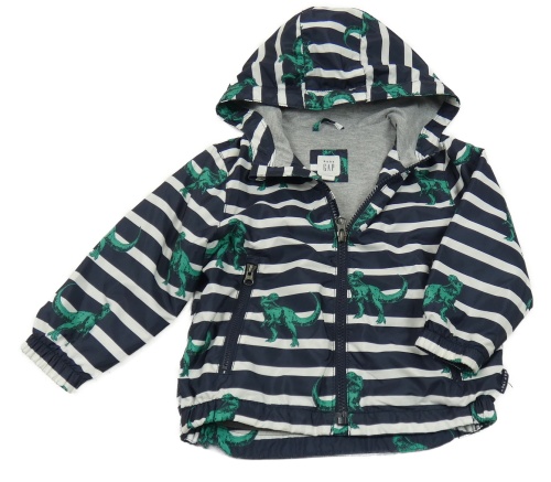 Tmavomodro-biela pruhovaná šušťáková jarná bunda s dinosaurami a kapucňou GAP