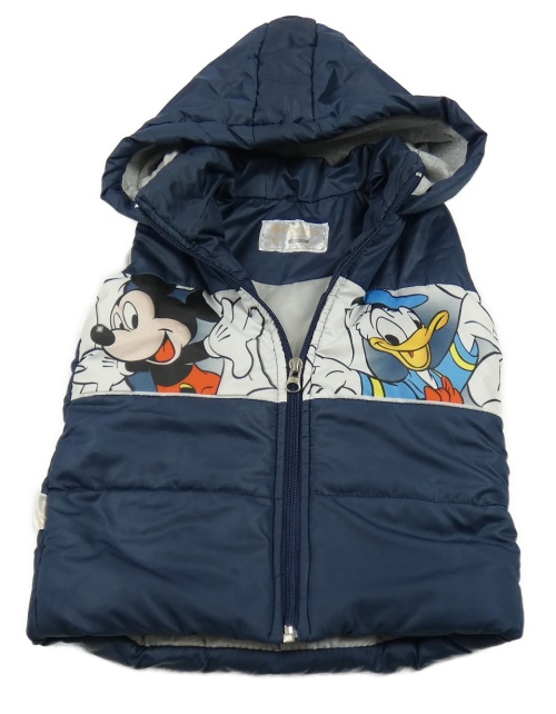 Tmavomodro-biela šušťáková zateplená vesta s Mickeym s Donaldem a kapucňou