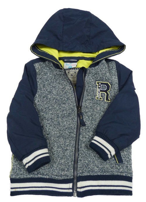 • Tmavomodro-bílý melírovaný pleteno/šusťákový jarní bomber s písmenkom a pruhmi a kapucňou Topomini