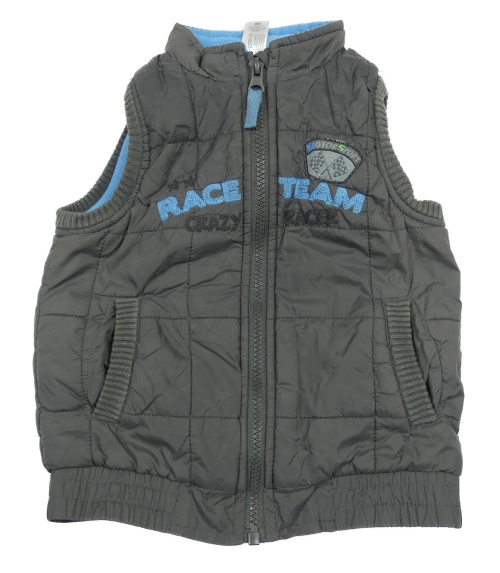 • Tmavosivá prešívaná šušťáková zateplená vesta s nápismi a praporky a číslom C&A