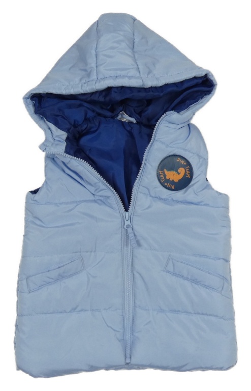 • Svetlomodrá prešívaná šušťáková zateplená vesta s nášivkou a kapucňou so cute