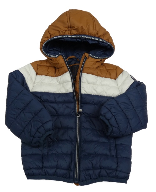 Tmavomodro-bielo-hnedá prešívaná šušťáková zimná bunda s nášivkou a kapucňou C&A