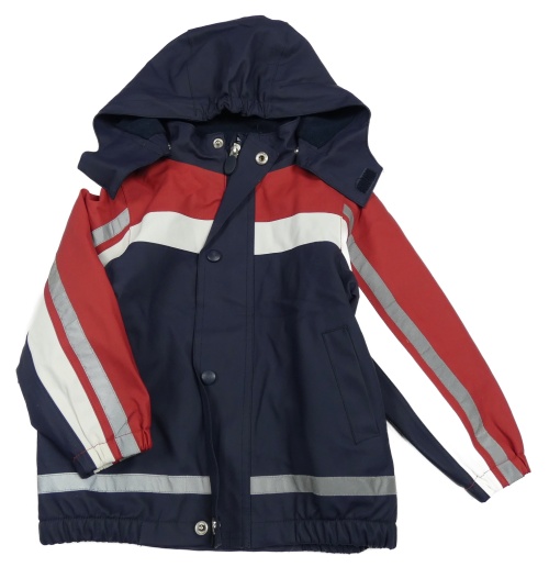 Tmavomodro-červreno-biela nepromokavá jarná bunda s kapucňou