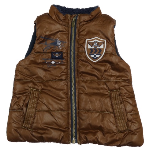 Hnedá šušťáková zateplená vesta s nášivou a lietadlom Pusblu