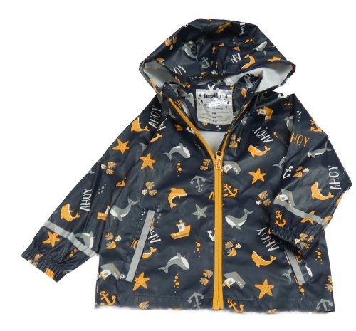 Tmavomodrá nepromokavá bunda s velrybami a rybkami a kapucňou Lupilu