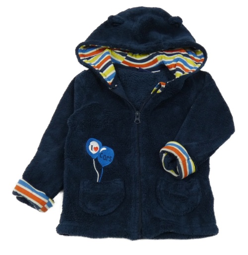 Tmavomodrá plyšová bunda s balonky a pruhmi a kapucňou s uškami lupilu