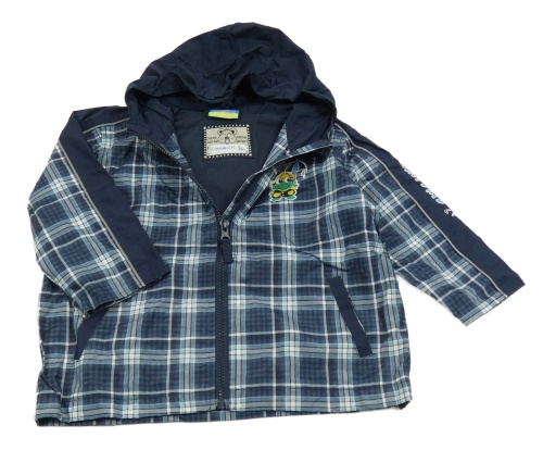 Tmavomodrá kockovaná šušťáková jarná bunda s žabičkou a kapucňou Topolino