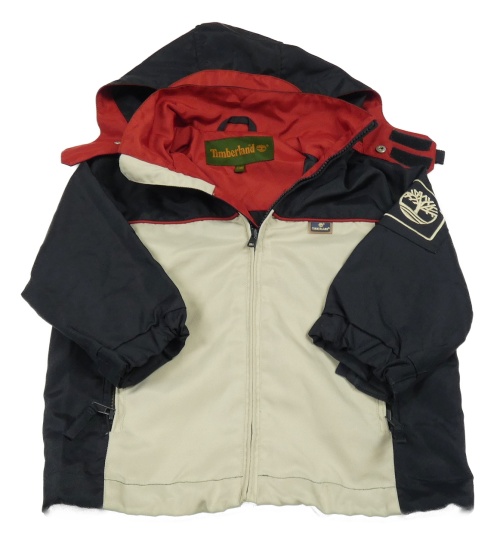 Béžovo-tmavmodro-červená šušťáková jarná bunda s odopínacíá kapucňou