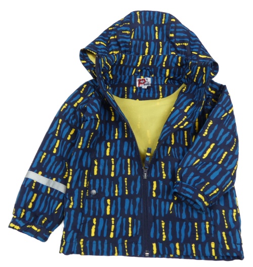Tmavomodro-modro-žltá vzorovaná šušťáková jarná bunda s odopínacíá kapucňou