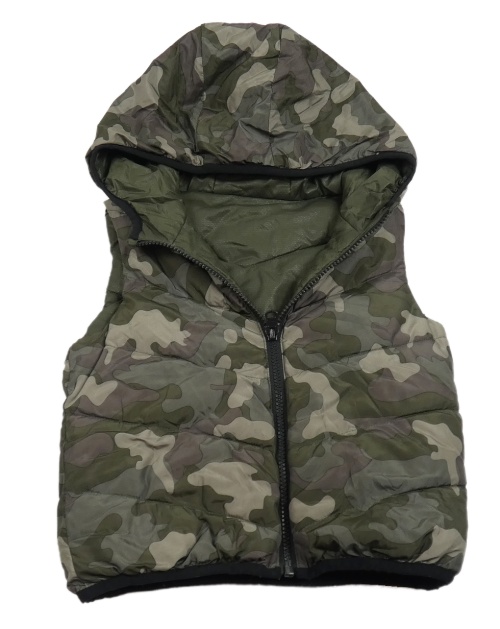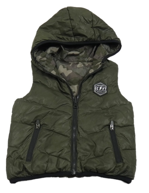 Khaki šušťáková zateplená obojstranná vesta s nášivkou a kapucňou