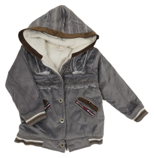 Sivá zamatová zateplená bunda s nápismi a kapucňou