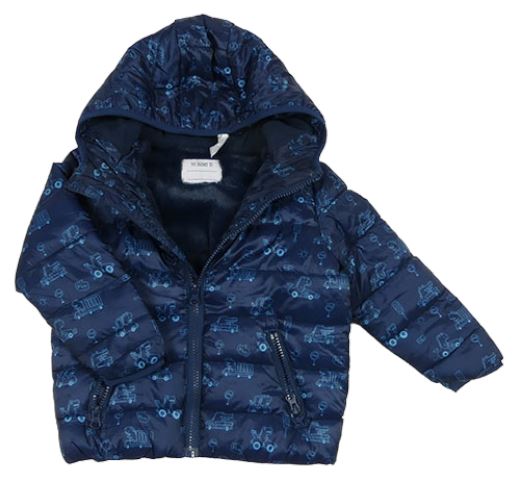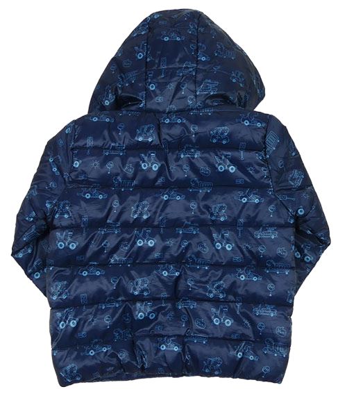 • Tmavomodrá prešívaná šušťáková zimná bunda s dinosaurami a autami a kapucňou M&Co