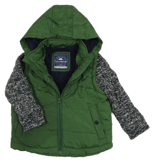 • Tmavozelená prešívaná šušťáková zateplená vesta s tmavomodro/bílými melírovanymi pletenymi rukávy a kapucňou George