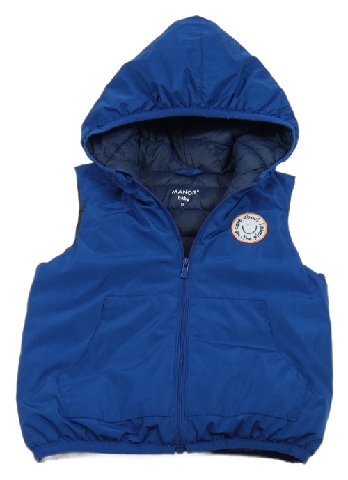 Modrá šušťáková zateplená vesta s nášivkou a kapucňou