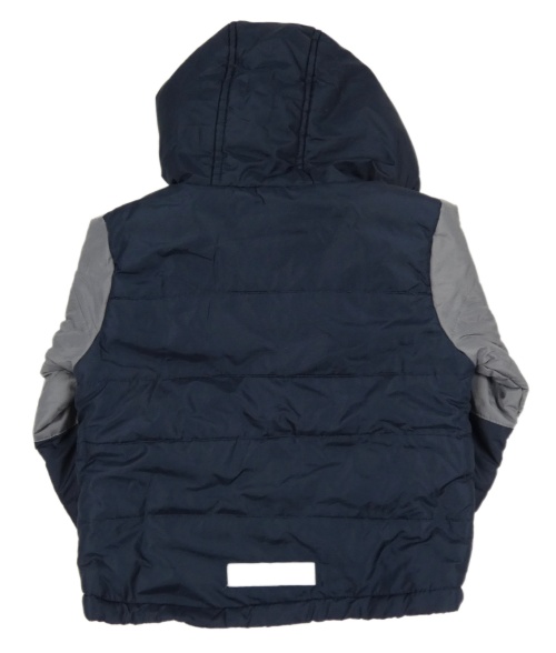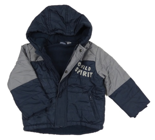 • Tmavomodro-sivá prešívaná šušťáková zimná bunda s nápismi a kapucňou lupilu