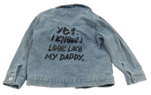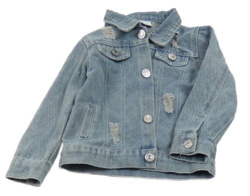 Svetlomodrá rifľová bunda s vyšúchaním a nápismi a golierikom