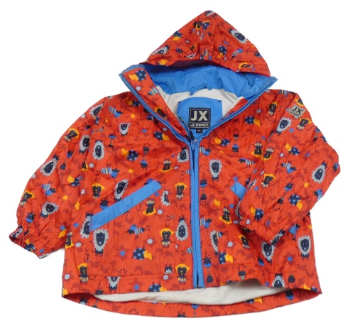 Červená šušťáková jarná bunda so zvieratkami a kapucňou