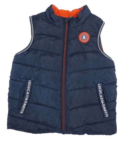 Tmavomodrá prešívaná šušťáková zateplená vesta s nášivkou