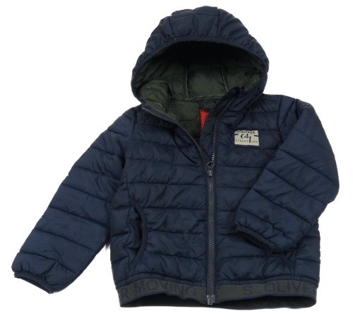 • Tmavomodrá prešívaná šušťáková zateplená bunda s nápisom a kapucňou S. Oliver