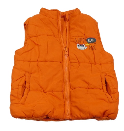 Tmavooranžová prešívaná šušťáková zateplená vesta s nápismi a líškou petits