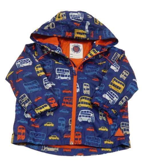 Tmavomodrá šušťáková jarná bunda s autobusmi a kapucňou Mothercare