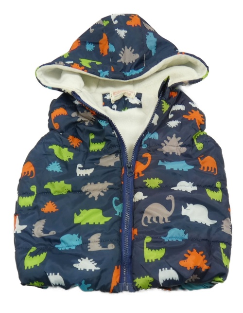 Tmavomodrá šušťáková zateplená vesta s dinosaurami a kapucňou