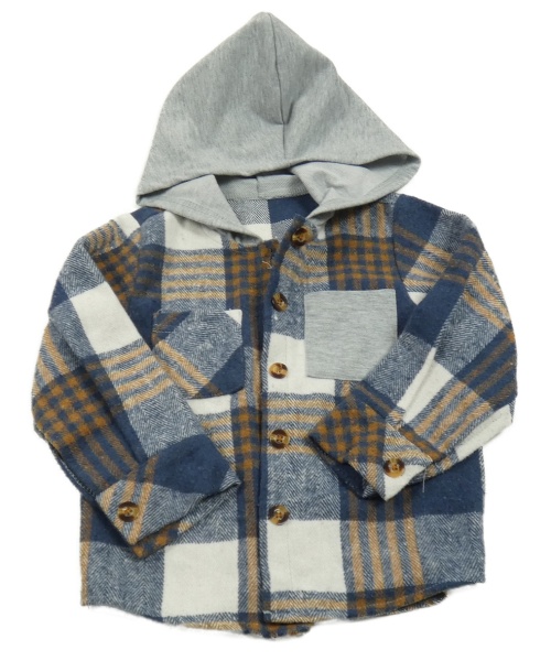 Tmavomodro-bielo-okrovo-sivá kockovaná flaušová košeľová bunda s kapucňou