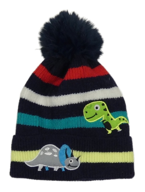 Tmavomodrá pletená podšitá čapica s dinosaurami a pruhmi