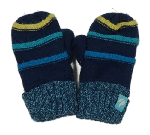 Tmavomodro-zeleno-žluté pruhované pletené palcové rukavice