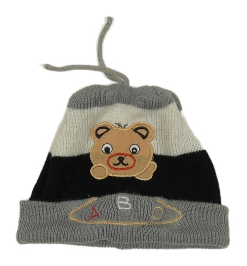 Sivo-bielo-čierna pletená čapica s medvedíkom a písmenky